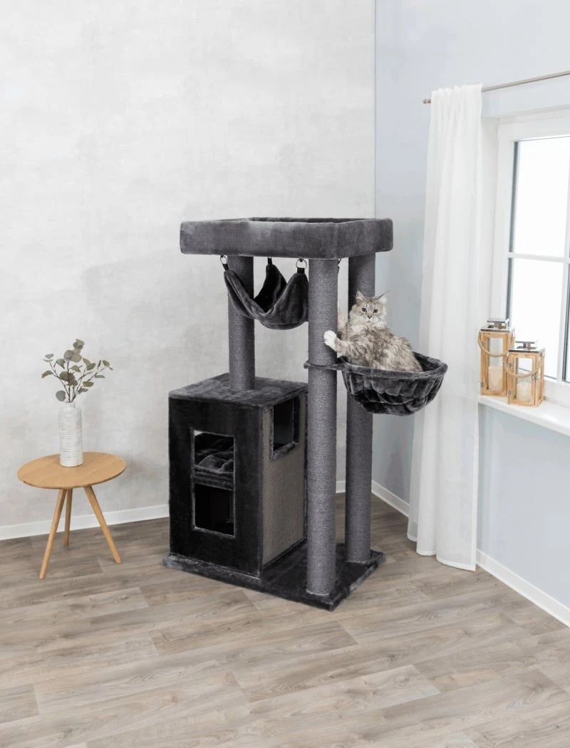 Il possède des poteaux à griffer en sisal naturel et quatre différents types de couchages à différentes hauteurs : un abri douillet à deux étages avec coussin matelassé réversible, un sac confort robuste, rembourré et matelassé, un hamac amovible, rembourré et matelassé et pour finir un lit douillet avec rebord rembourré et coussin lui permettant de se percher afin de surveiller la maison ainsi que l’extérieur par la fenêtre.