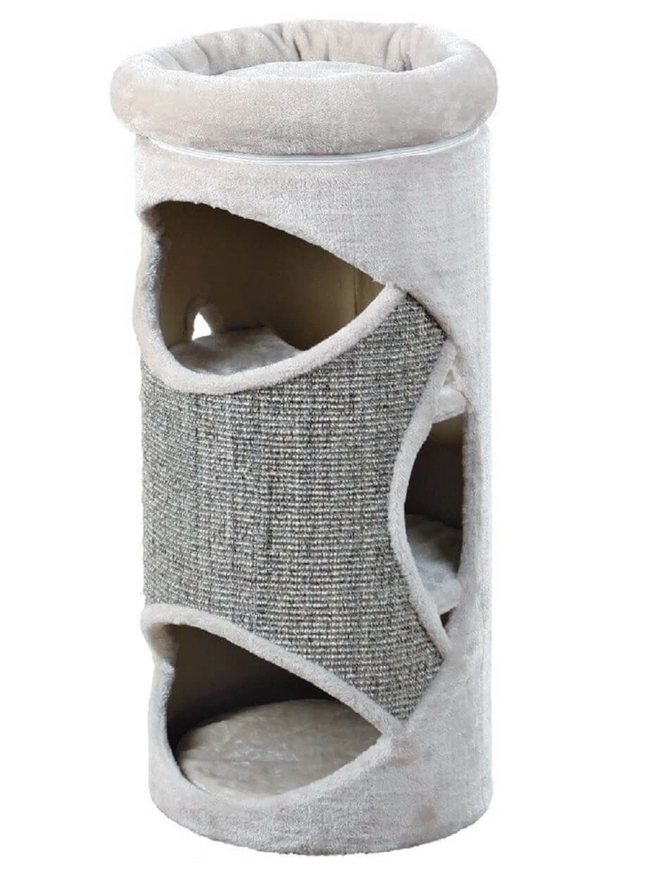 De couleur gris clair, il se mariera très bien dans votre salon ou dans une autre pièce de votre intérieur. Cette tour dispose de 3 étages, habillés de peluche/feutre (étage 2 et 3 reliés) et d’une plateforme avec coussin douillet déhoussable.